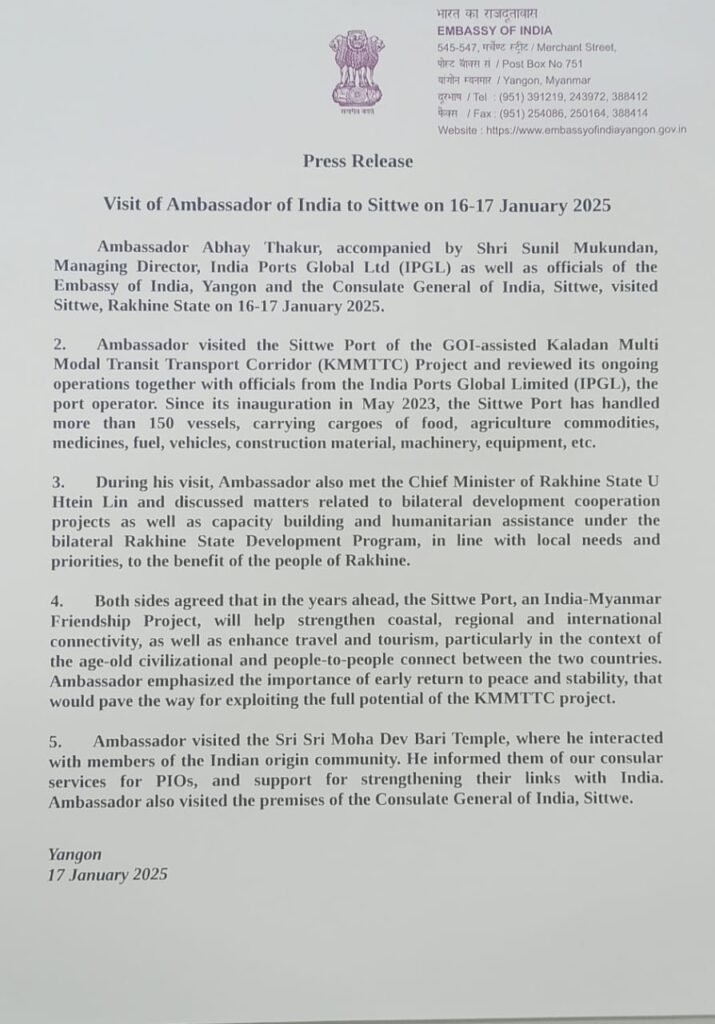 The Embassy of India in Myanmar, based in Yangon, announced on January 17 that Indian Ambassador to Myanmar, Abhay Thakur, visited Sittwe, a city currently experiencing military tensions between the Arakan Army (AA) and the Myanmar junta, on January 16.